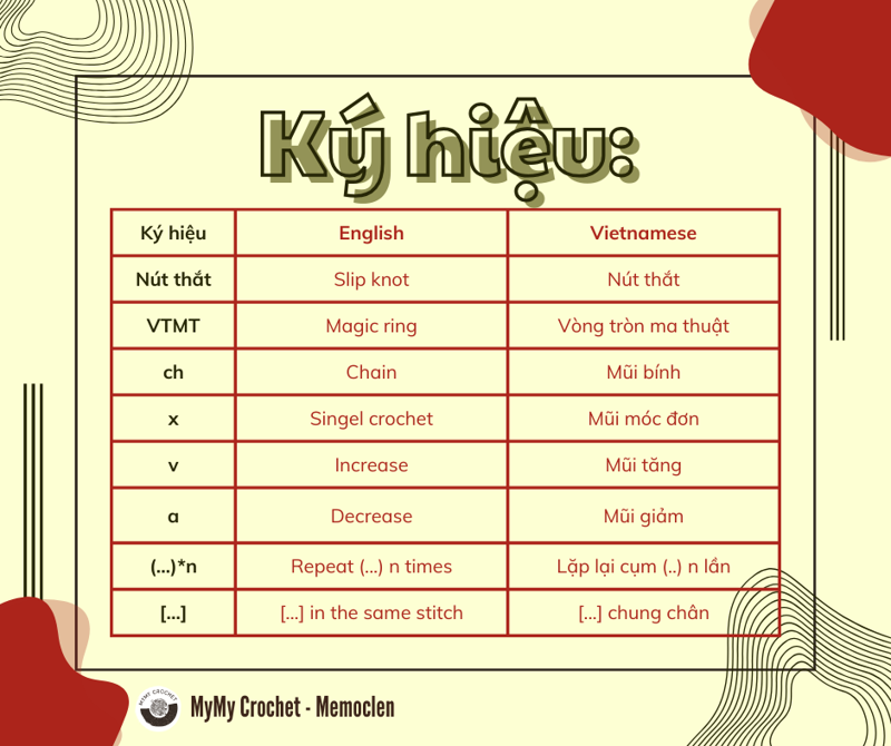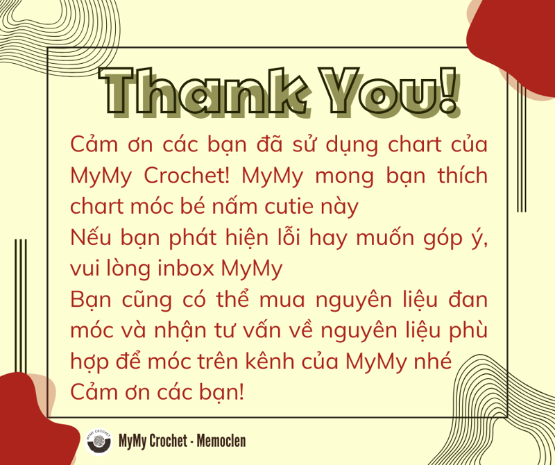 Nguyên liệu: về cơ bản, bạn có thể sử dụng bất cứ loại len, màu sắc nào hiện có. Vì ko có chart cố định cho một loại len. Nhưng lưu ý rằng kích thước sản phẩm sẽ thấy đổi theo kích thước loại len và size kim móc. Bạn có thể mua set nguyên liệu trên website này hoặc liên hệ với mình qua Facebook hoặc Shopee nha. Các bạn nếu đang băn khoăn không biết nên chọn loại len nào để móc thì đây là vài gợi ý của MyMy về loại len nha: