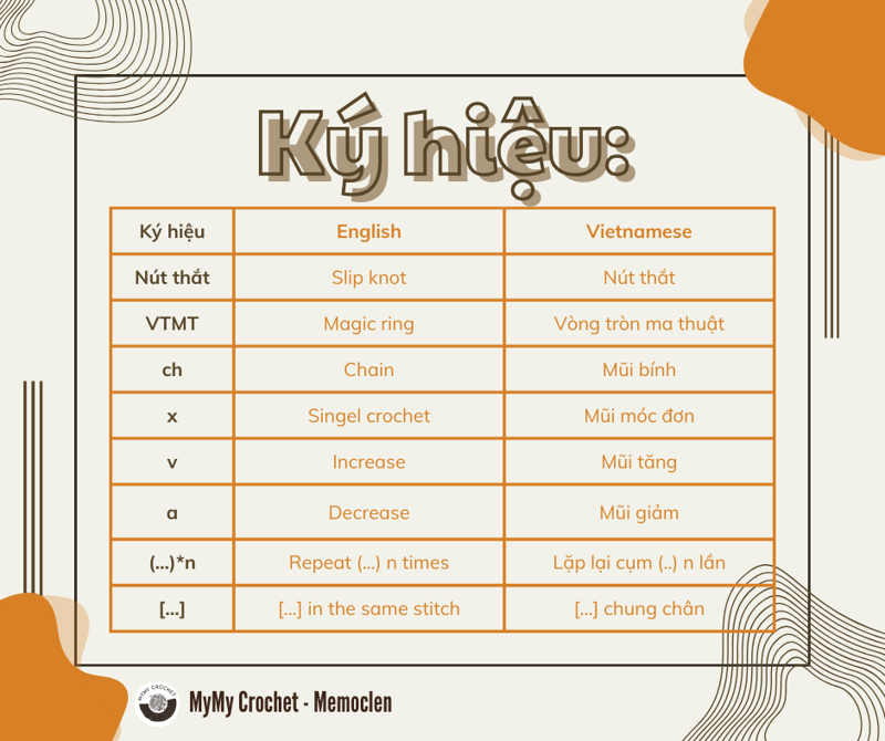 Nguyên liệu: về cơ bản, bạn có thể sử dụng bất cứ loại len, màu sắc nào hiện có. Vì ko có chart cố định cho một loại len. Nhưng lưu ý rằng kích thước sản phẩm sẽ thấy đổi theo kích thước loại len và size kim móc. Bạn có thể mua set nguyên liệu trên website này hoặc liên hệ với mình qua Facebook hoặc Shopee nha. Các bạn nếu đang băn khoăn không biết nên chọn loại len nào để móc thì đây là vài gợi ý của MyMy về loại len nha: